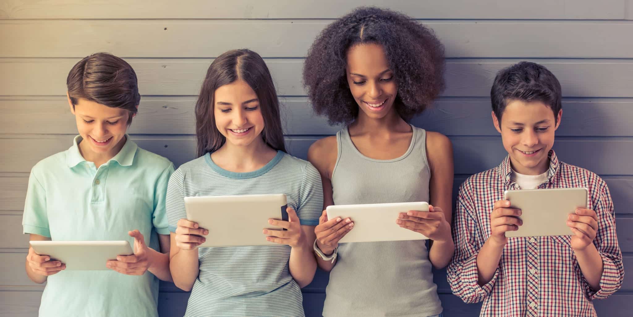 Group of teenage boys and girls is using tablets and smiling while standing against gray wall