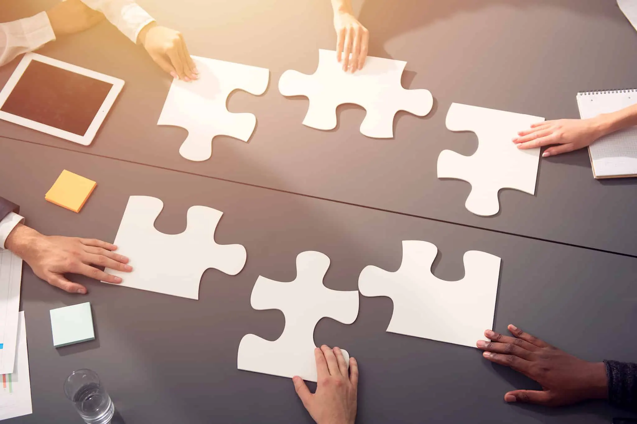Businessmen working together to build a puzzle. Concept of teamwork, partnership, integration and startup.
