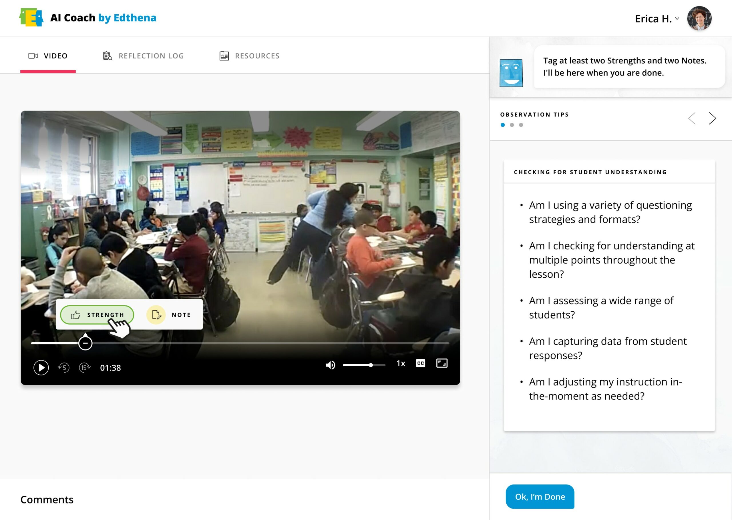 AI Coach is an adaptive, first-of-its-kind solution that uses AI to support teachers as they work through coaching cycles. Using the platform, teachers independently reflect on their practice and set near-term goals as part of a self-paced module that mirrors the instructional coaching process. Teachers have an interactive conversation with Edie, the AI-driven coach, who asks probing, open-ended questions and offers personalized tips for improvement.