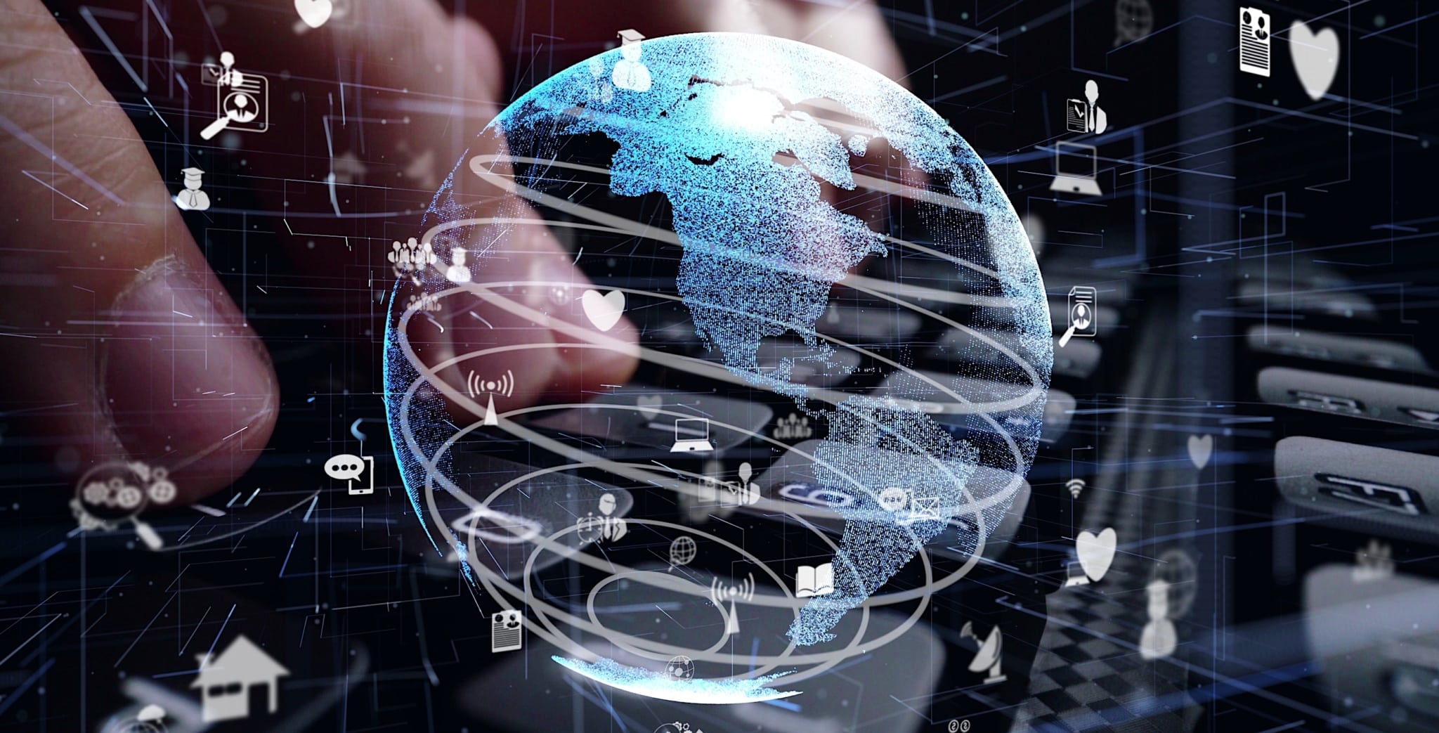 Man working on computer keyboard with graphic of internet network modernization showing concept of 5G wireless connection and social media .