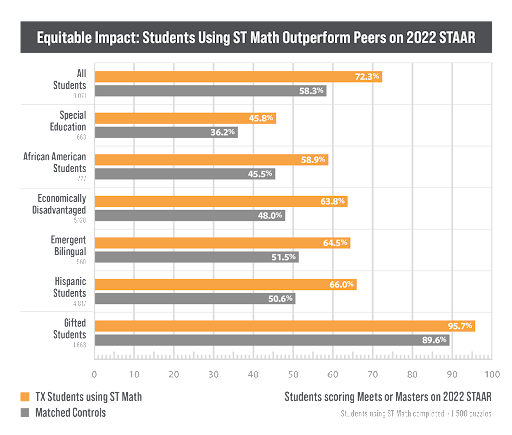 Irvine, Calif., June 14, 2023—A recent study conducted by MIND Research Institute shows that students who used the ST Math program made significantly higher gains in math proficiency. The study, which included over 160,400 students across Texas, found a 13.6 percentage point advantage in growth in percent of students achieving “Meets” or “Masters” on the 2022 STAAR for students who used ST Math with fidelity.