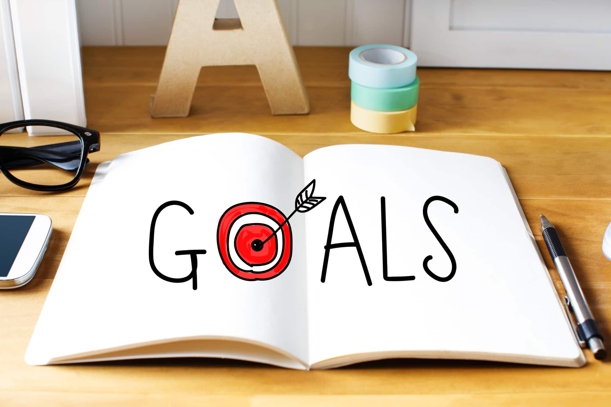 Goals concept with notebook on wooden desk