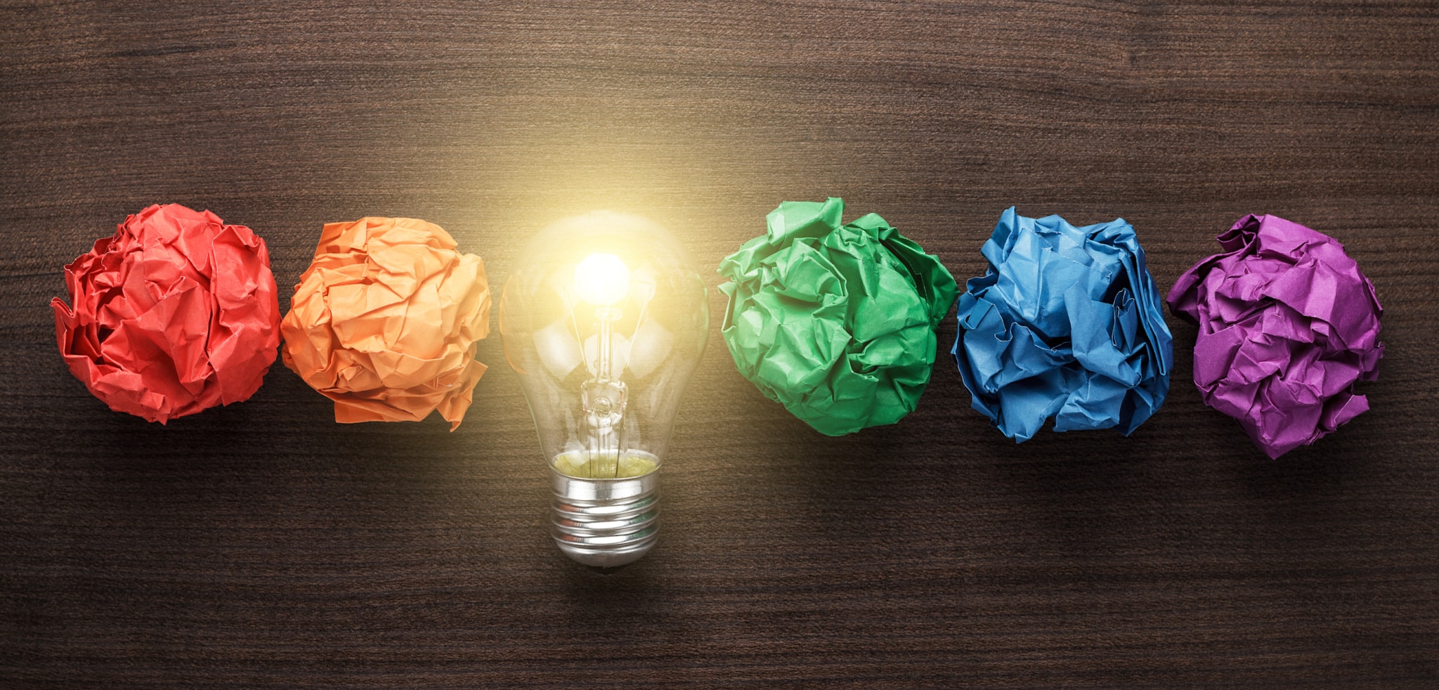 great idea concept with crumpled colorful paper and light bulb on wooden table