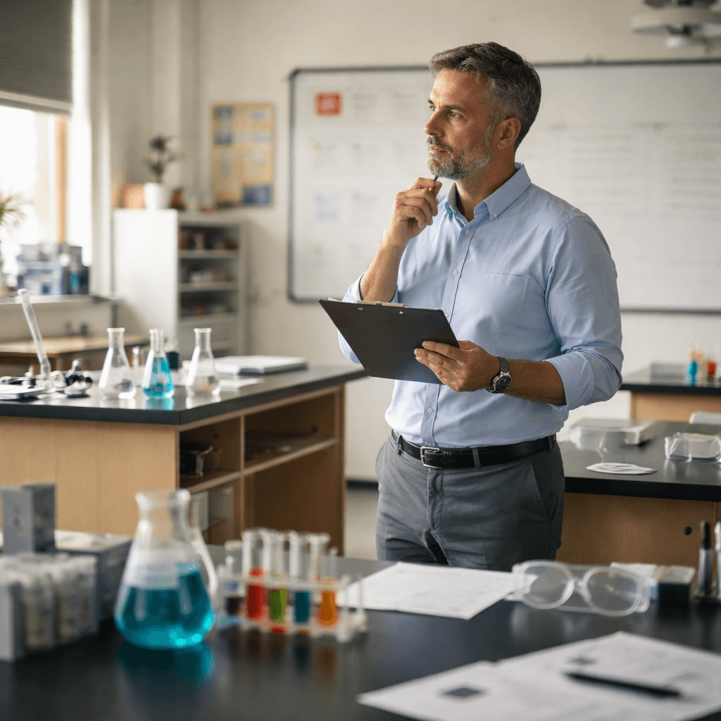 A student bumps a lab table during cleanup. A container tips, and liquid spreads across the surface. The situation is controlled quickly. No one is hurt. The class resets, and the day continues.