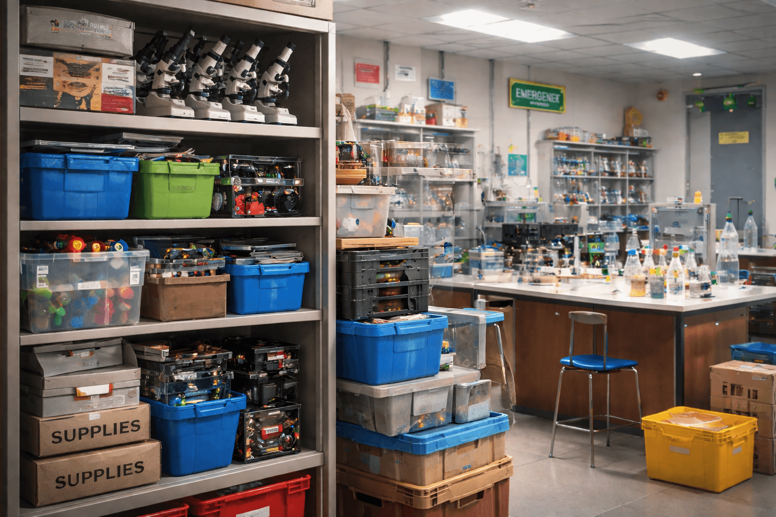 Microscopes stacked higher than intended. Robotics kits are placed on top of cabinets. Boxes of supplies are tucked into corners because there simply isn’t another place for them. None of these adjustments looks dangerous on its own. In fact, they often look like practical solutions created by teachers trying to make the most of the space they have.