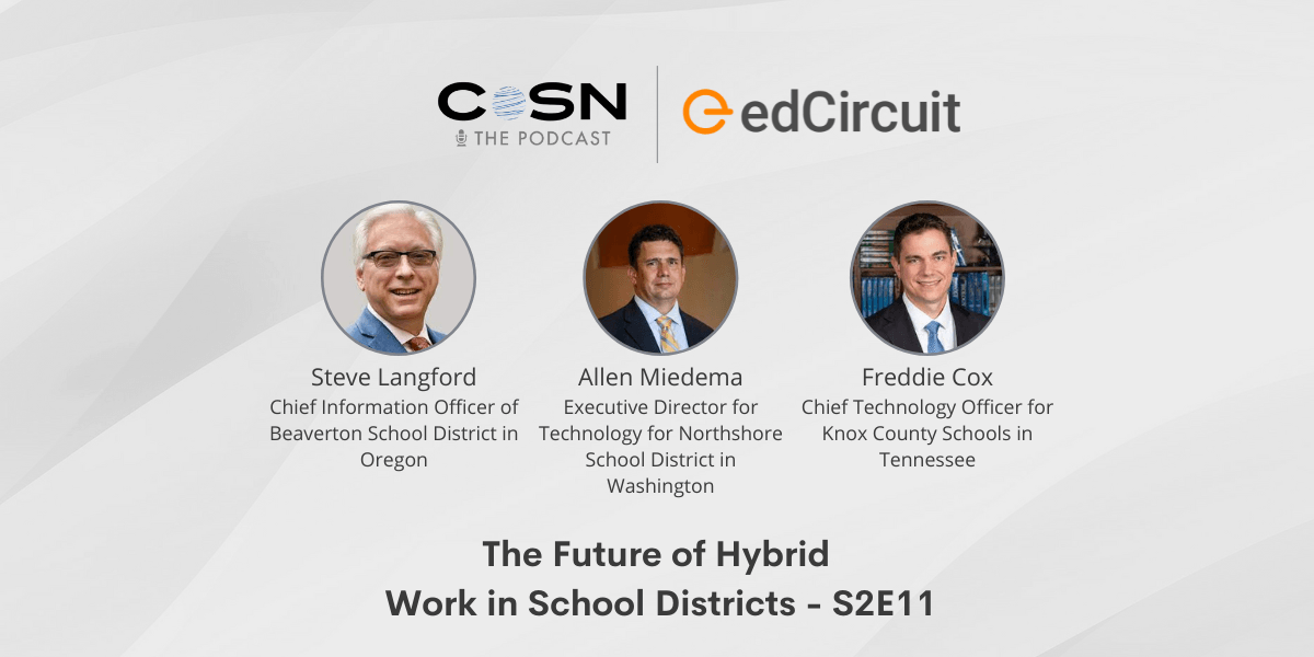 Today’s guests are technology leaders from large school districts around the country: Steve Langford, Chief Information Officer of Beaverton School District in Oregon; Allen Miedema, Executive Director for Technology for Northshore School District in Washington; and Freddie Cox, Chief Technology Officer for Knox County Schools in Tennessee. They chat with edCircuit about the hybrid work environments they’ve developed in their districts, what a positive culture looks like in a remote environment, and more.