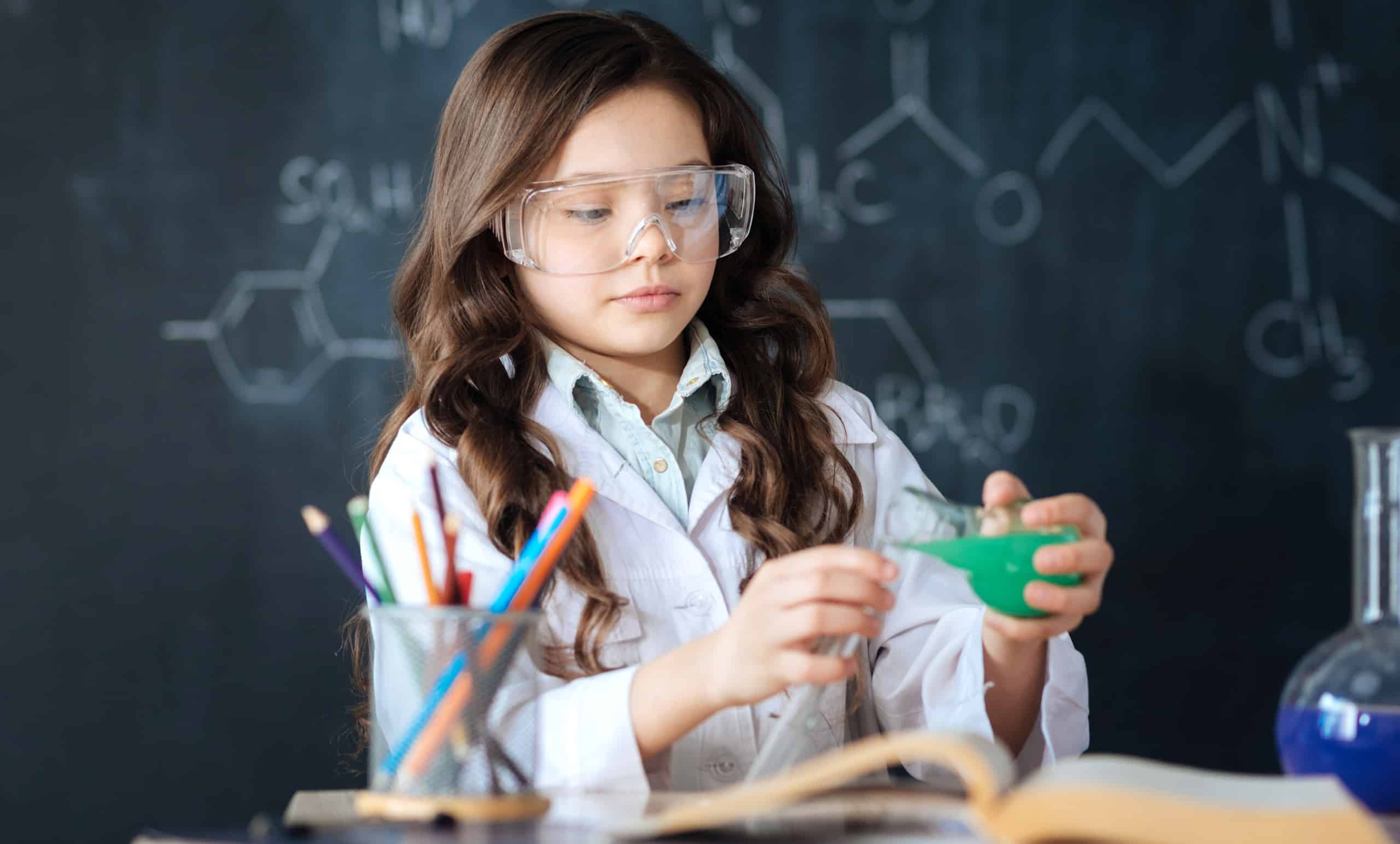 Enjoying my future profession. Talented hardworking skillful child standing in the laboratory and enjoying chemistry experiment while taking part in the science project and exploring the bulb
