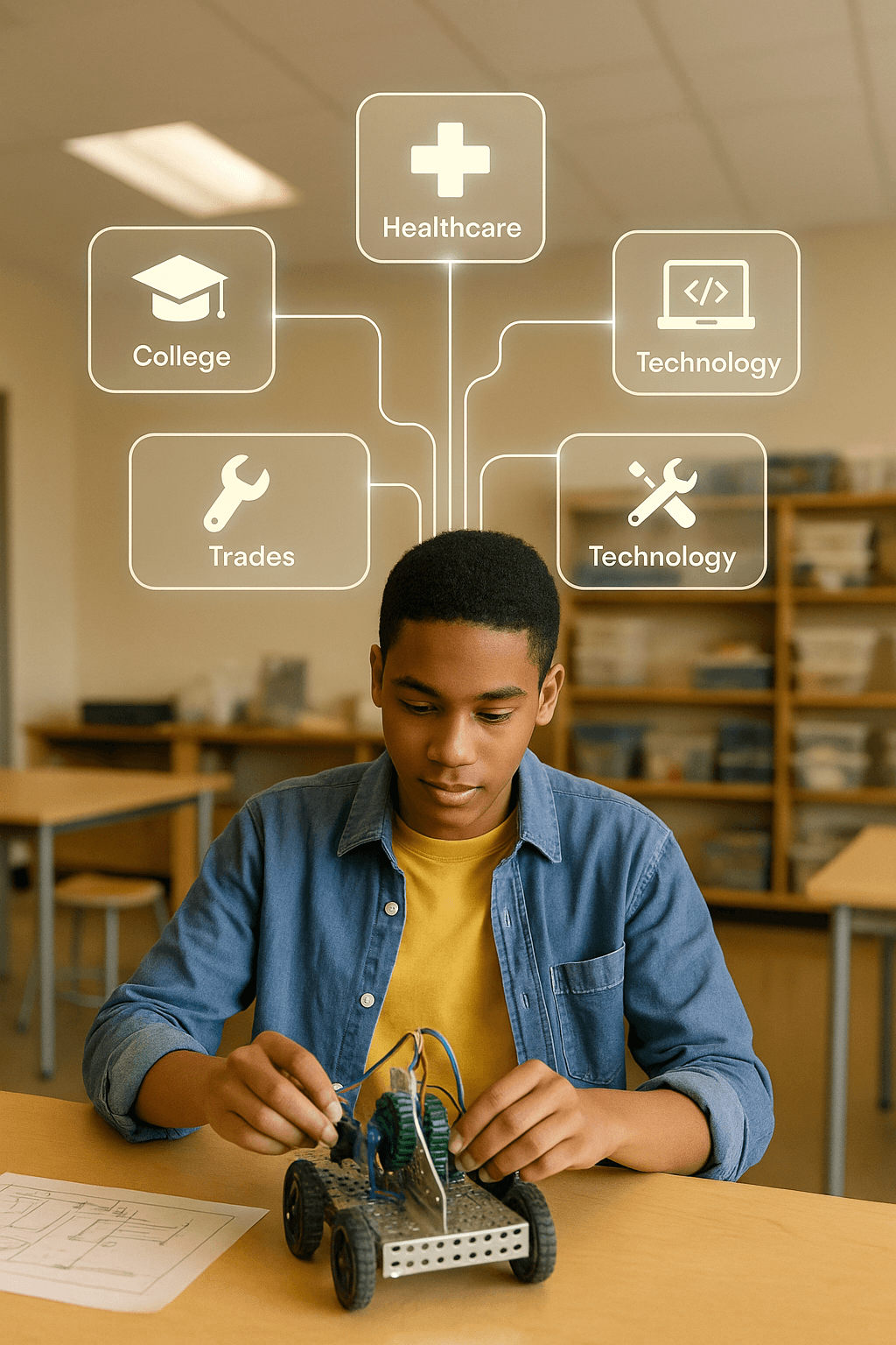 Clear alignment between high school experiences and college, trade schools, or direct-to-work options.