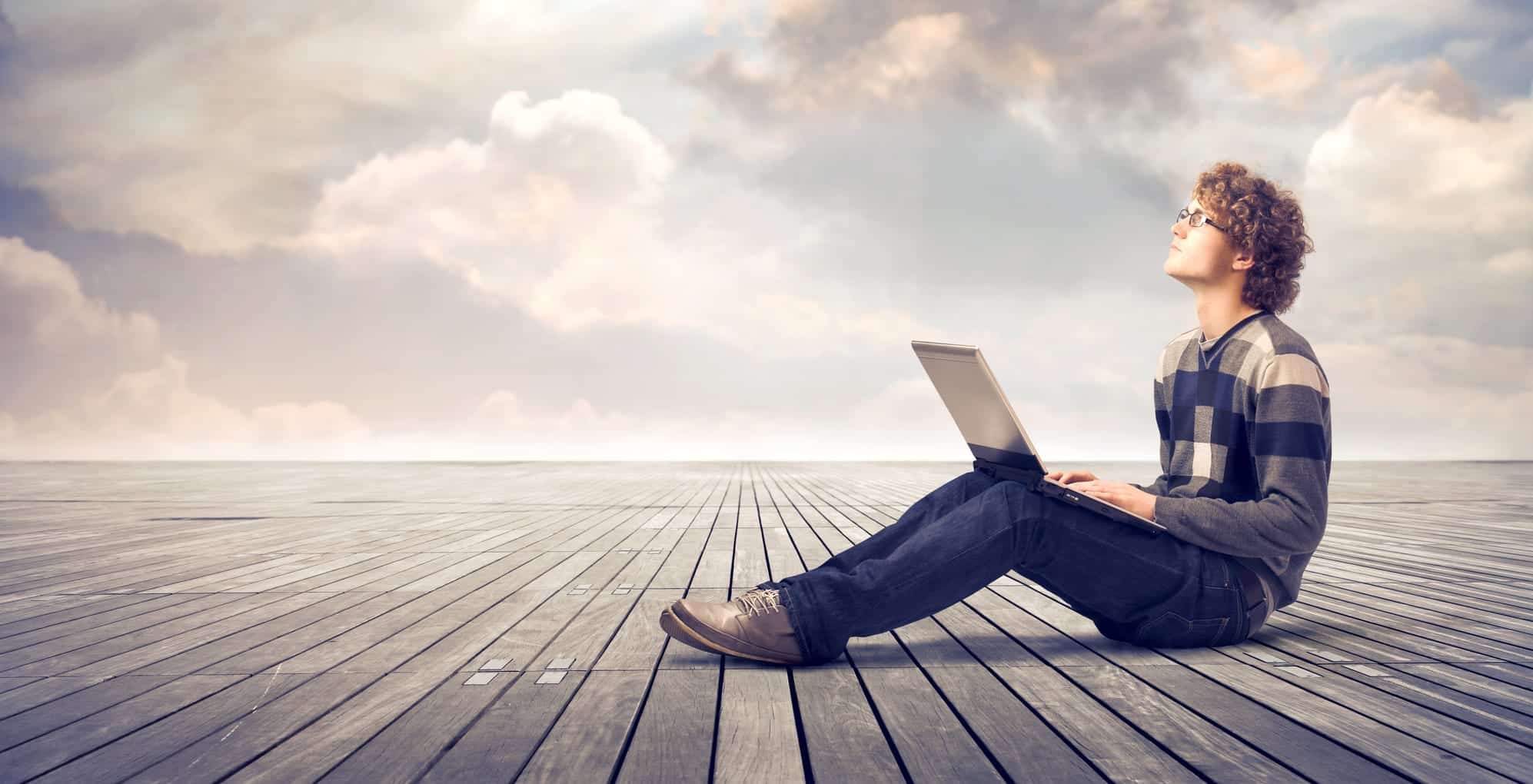 Young man sitting on a parquet floor and using a laptop